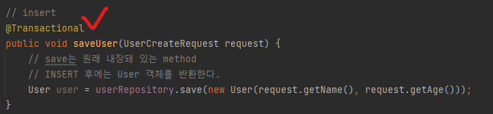 - 즉, 위 사진 왼쪽 코드의 userRepository.save(user) 부분 없이 오른쪽 사진처럼만 코드를 구성해도 DB에 알아서 update되는 것이다.