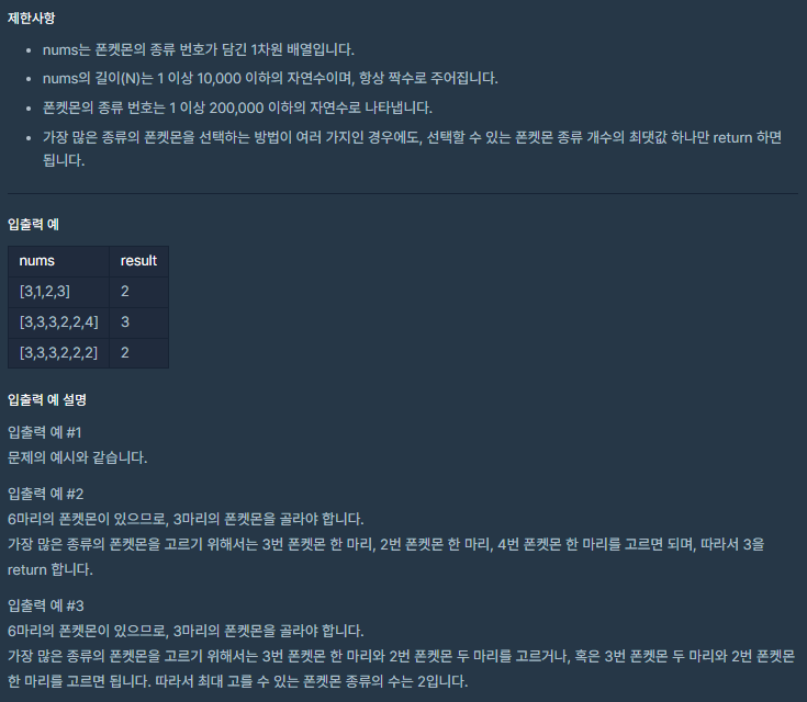 // 1. 폰켓몬의 종류 개수 > 가져갈 수 있는 폰켓몬 마릿수 ==> 가져갈 수 있는 폰켓몬 마릿수