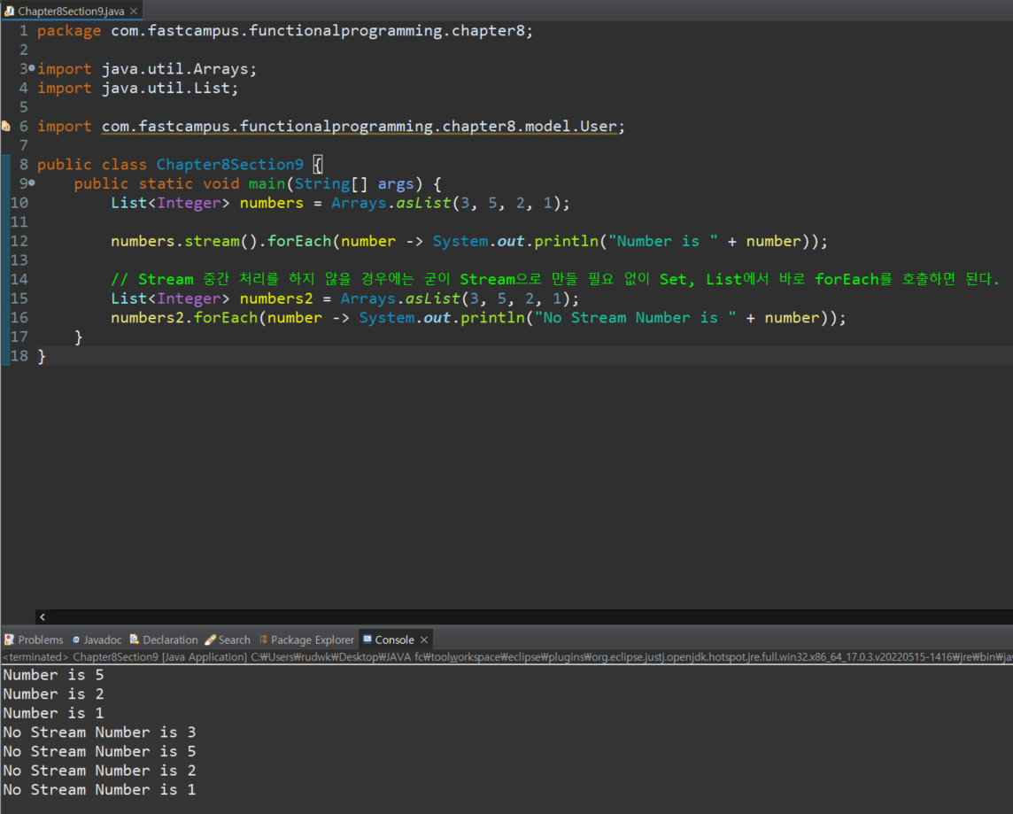 (= Stream 중간 처리(map, filter 등)를 사용하지 않는다면 Java의 iterable에도 forEach가 있기 때문에 굳이 Stream을 만들 필요 없이 바로 Set, List 등에서 forEach를 호출해도 된다.)