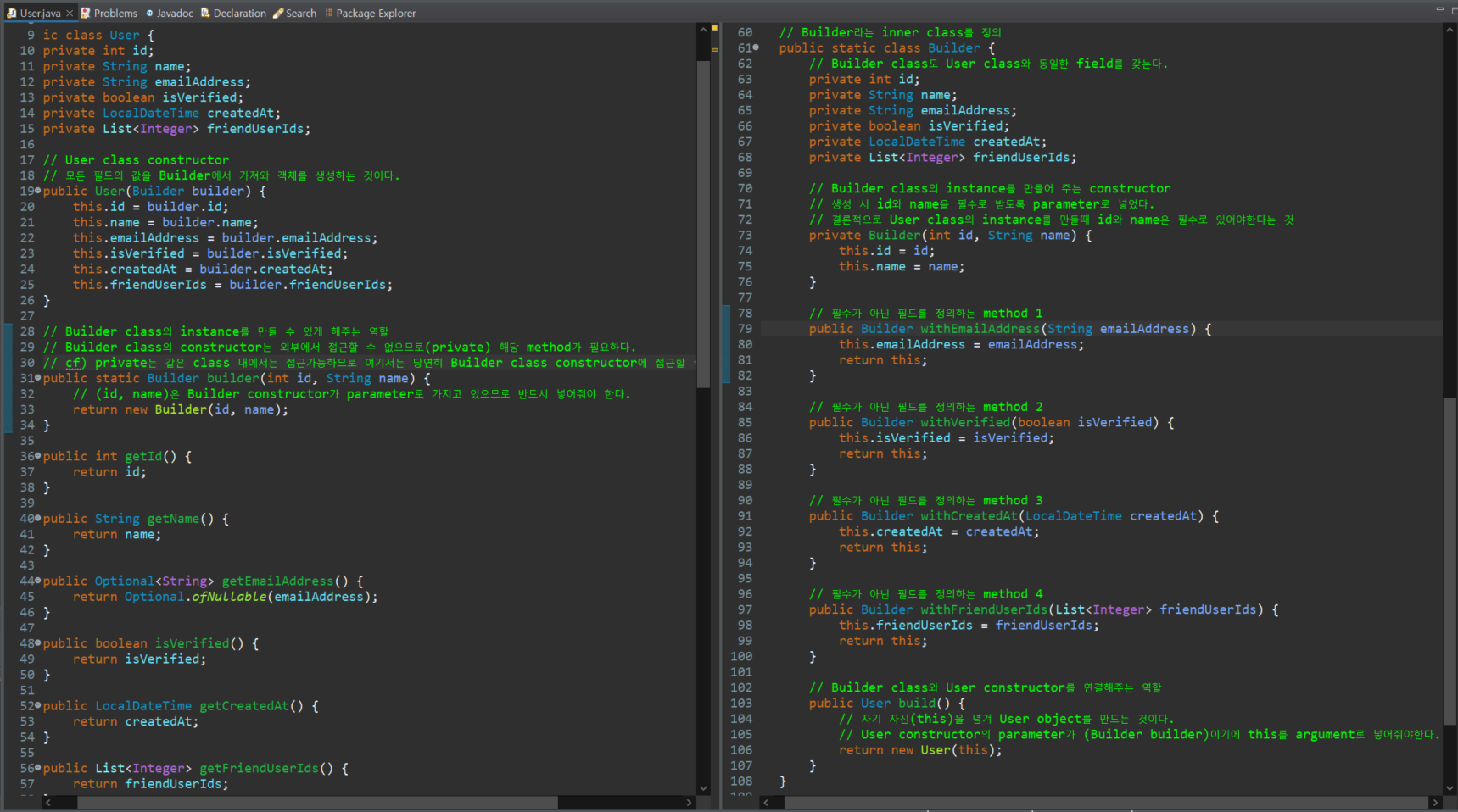 - Builder Pattern을 위해서는 User class안에 Builder 라는 'inner class'를 정의해야한다.