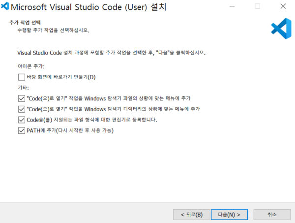 - 윈도우 OS는 VScode 설치 시 하단 2개가 체크 돼있어야 git 사용할 때 편하다.