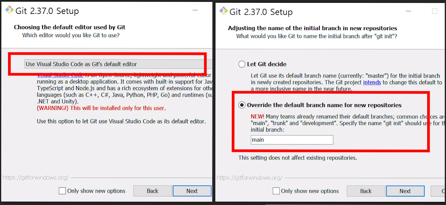 - Git 설치 시 아래 2개의 항목을 주의해서 설치하자(나머지는 기본 체크된 채로 두고 설치하면 된다.)