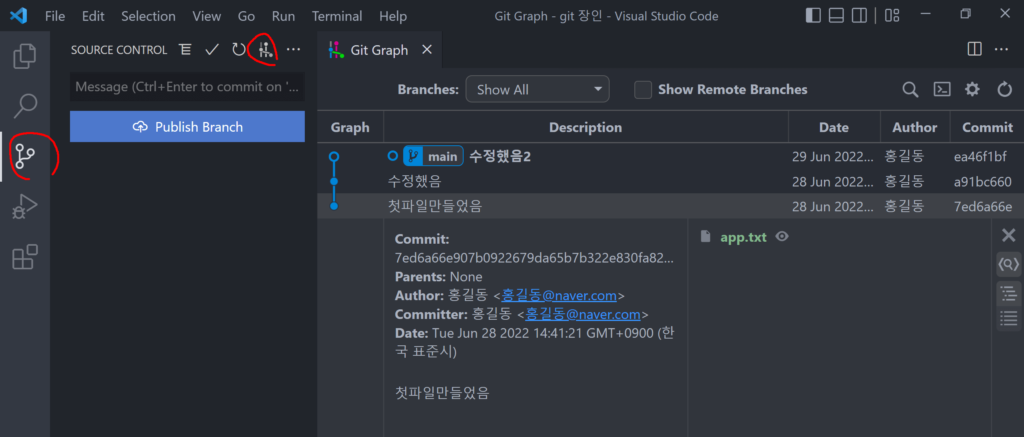- 설치 후 Git 메뉴에서 Git graph 버튼을 누르면 commit 내역을 한 눈에 볼 수 있고 파일명 우클릭하면 git diff도 가능하다.