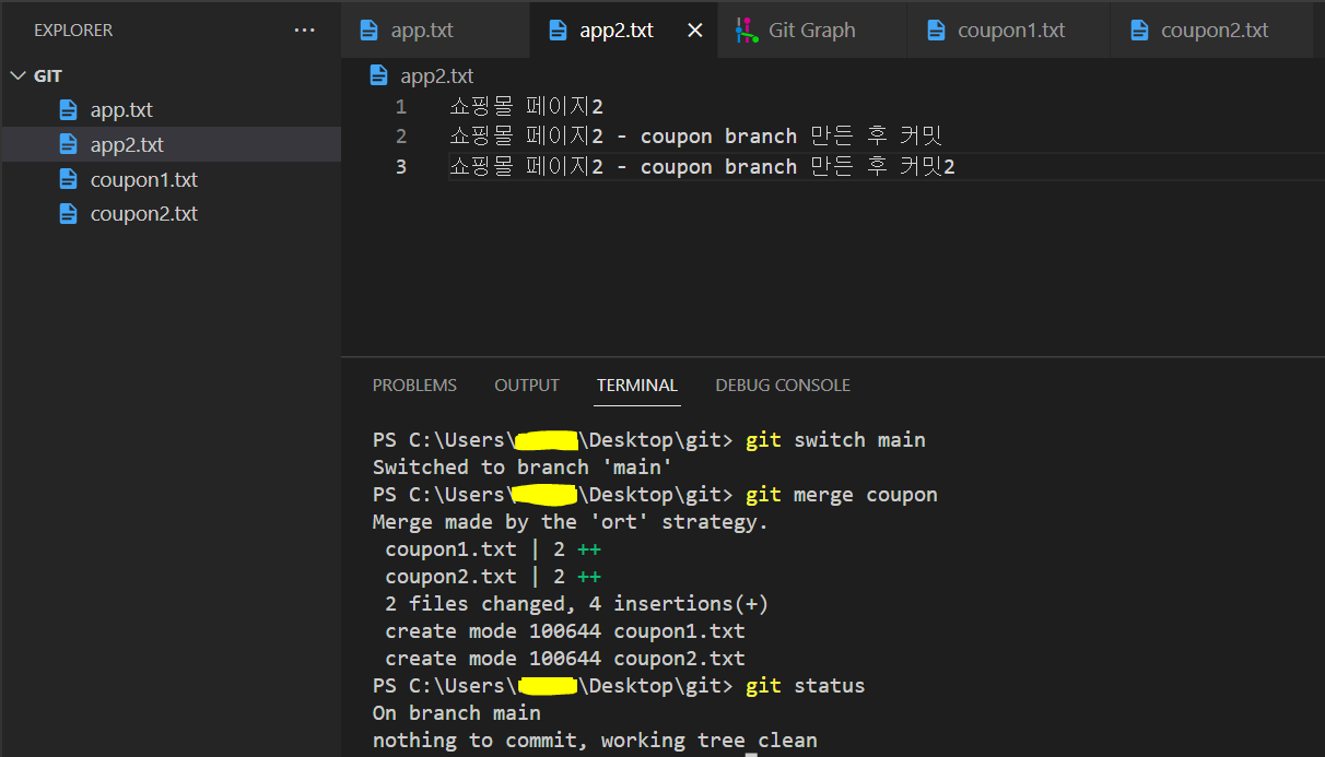 - 이제 main branch에서도 coupon branch에서 작업한 파일(coupon1.txt, coupon2.txt)이 보이는 것을 확인할 수 있다.