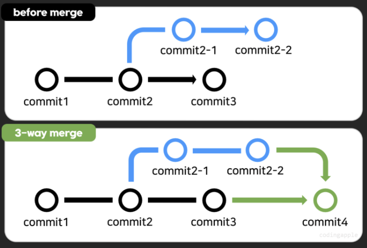 - 저번 글에서 한 merge 방식이 3-way merge이다. 이것이 merge의 기본 동작 방식