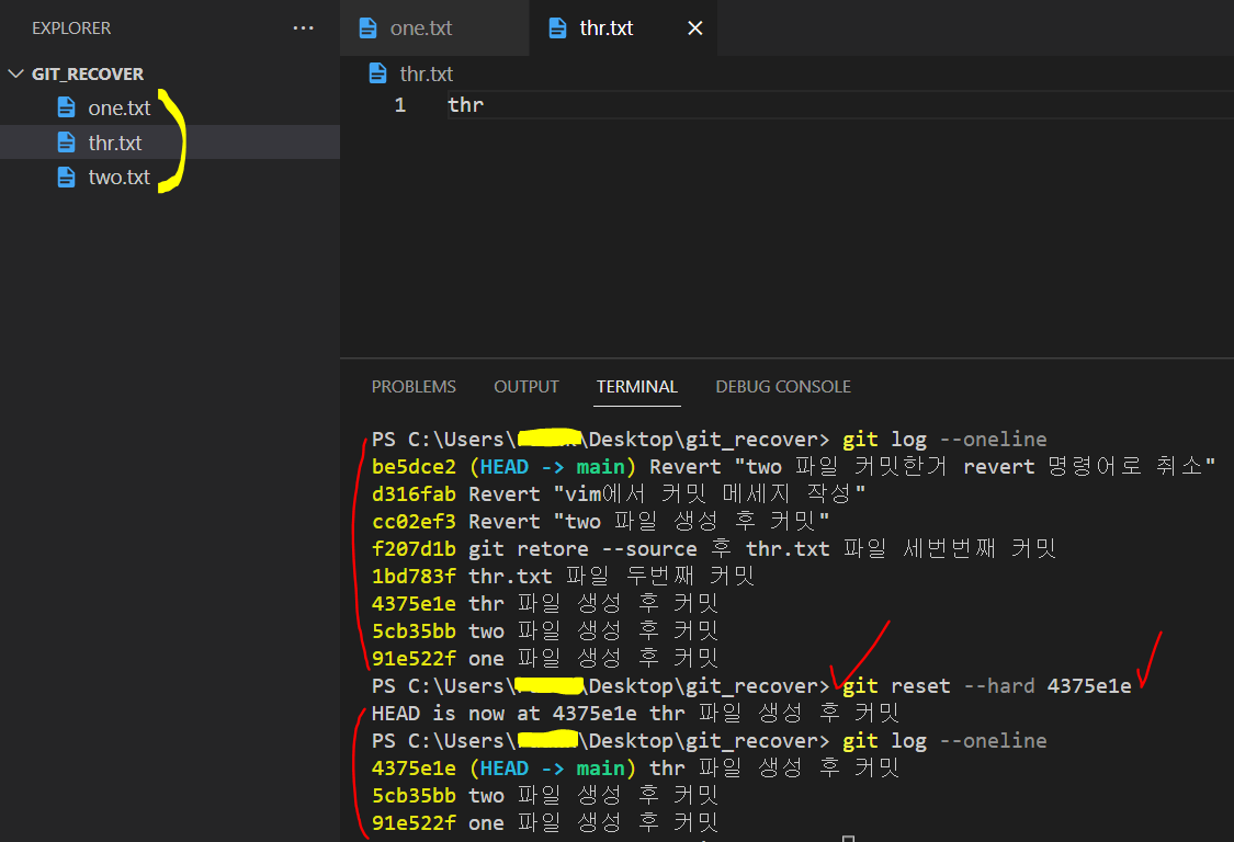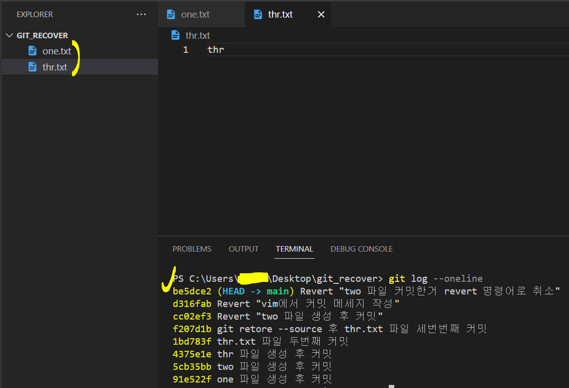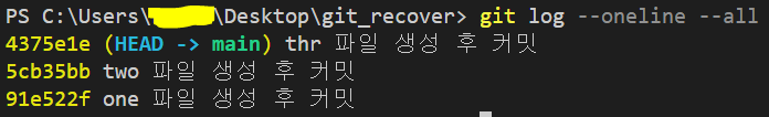 - 해당 폴더에서 git init 후 commit을 몇 번 했다.(파일 3개 생성, 만들 때 마다 commit)