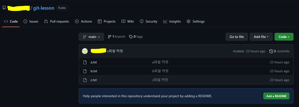 - git push 후 github를 보면 진짜로 로컬에 있던 파일과 commit 내역이 올라간 것을 확인할 수 있다.
