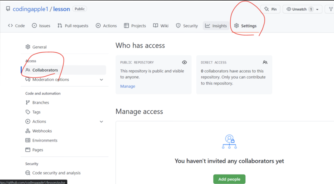 - 단, 새로온 팀원도 github 아이디가 있어야하고 해당 팀원의 아이디를 Collaborators 메뉴에 등록해놔야 협업 가능하다.