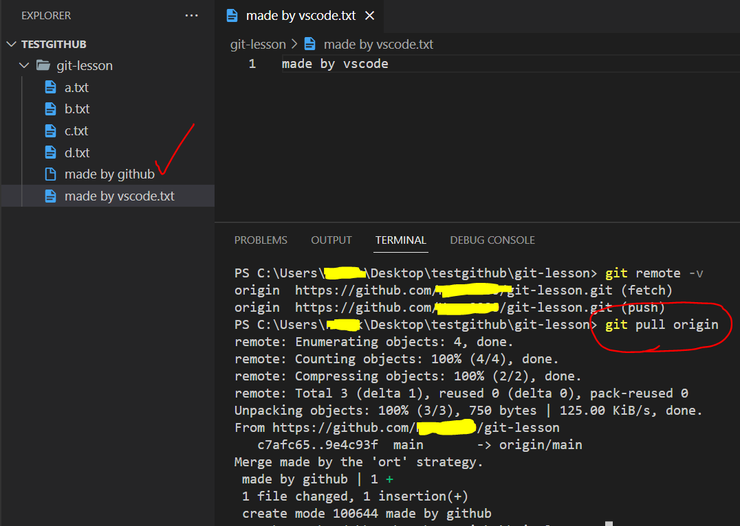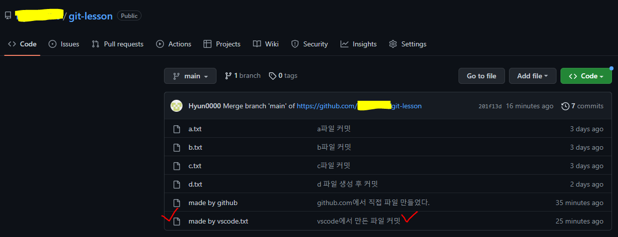 - made by vscode 라는 파일을 만든 후 평소대로 commit 하고 나서 git push 해보자