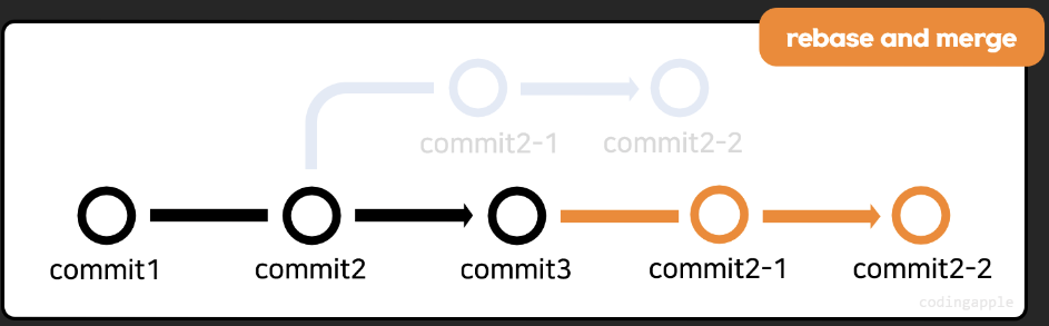- 결과는 squash and merge와 비슷한데 합쳐질 브랜치의 commit 내역이 전부 보존된다.