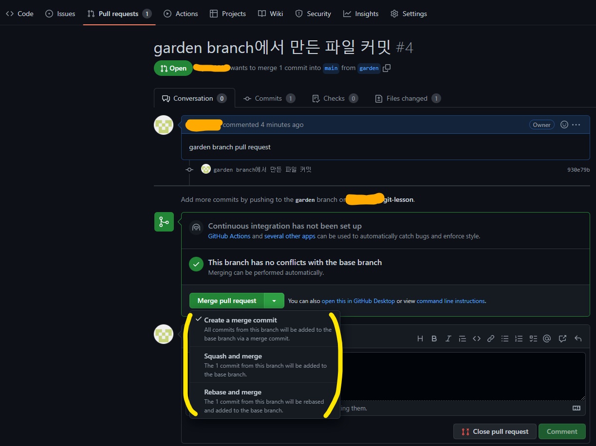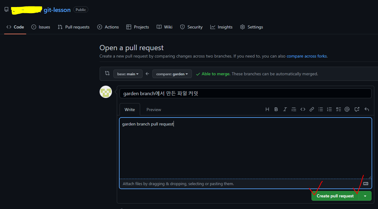 - 위에서 만든 garden branch를 이용해 Pull request를 연습해보자