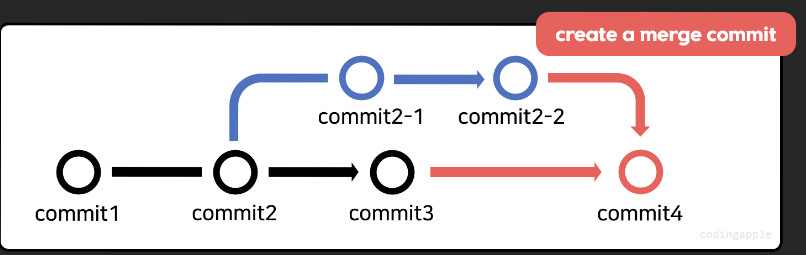 - 새로운 merge commit을 하나 생성해주는 3-way merge를 실행