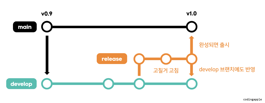 - 근데 이걸 또 바로 main branch에 합치기에는 불안하기 때문에 develop branch → release branch 이렇게 프로젝트를 복사한 다음 출시 준비를 한다.