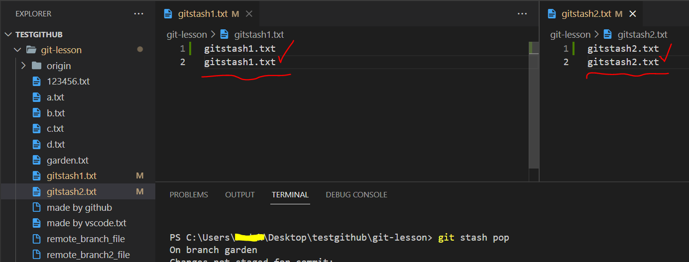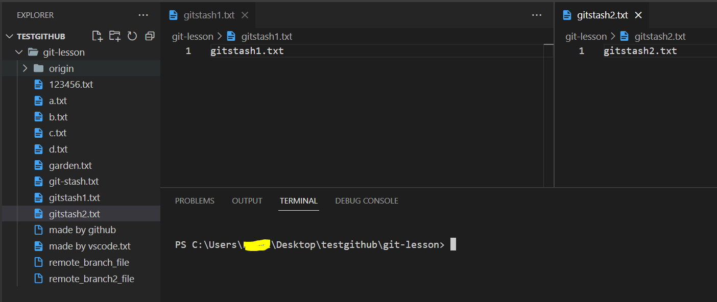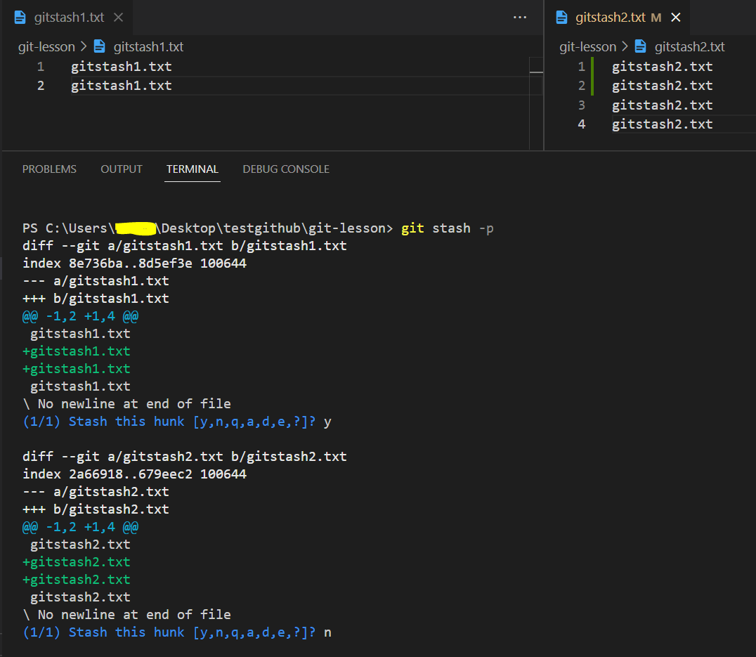 - gitstash1.txt 파일에만 y하고 gitstash2.txt 파일에는 n 했더니 gitstash1.txt의 내용만 stash에 보관됐다.