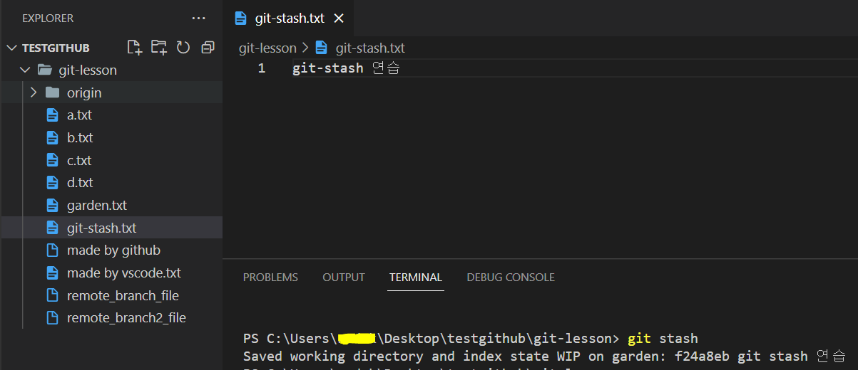 - 파일(git-stash.txt)을 하나 만든 후 commit 했다.