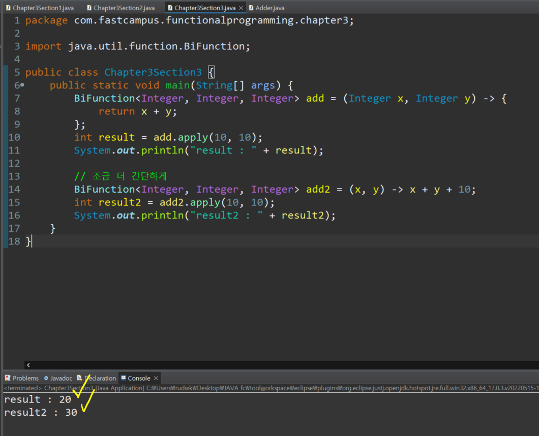 BiFunction<Integer, Integer, Integer> add2 = (x, y) -> x + y + 10;