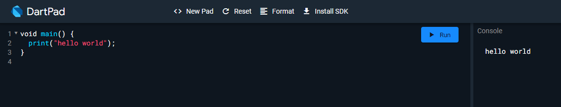 - VsCode에 Flutter나 Dart를 설치하면 좋지만 사실 이걸 어느정도 깊이까지 할지 모르기에 우선 온라인에서 Dart를 실행할 수 있는 사이트를 대신 사용한다.