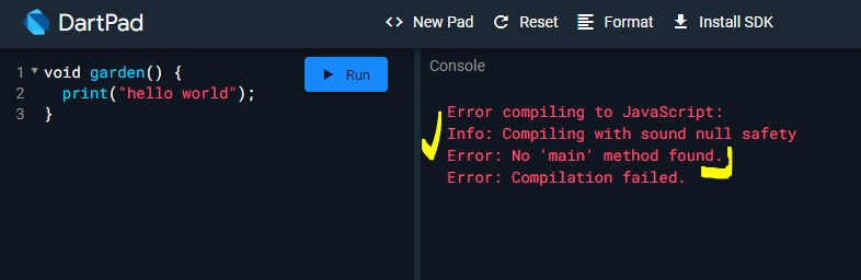 - 즉, Dart는 자동적으로 main method를 찾는다. 참고로 java도 main 함수가 있어야 실행된다.