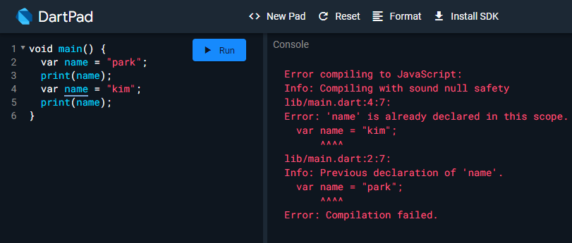 3. Dart에서는 var 키워드를 이용해도 동일한 변수명으로 재선언이 불가능하다. 단, 위에서 보듯이 재할당은 가능하다.