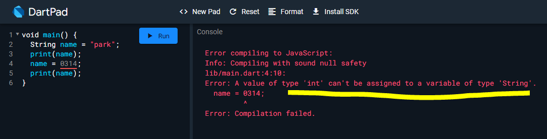 - why? Dart의 컴파일러가 name 이라는 변수가 String 이라는걸 알기 때문