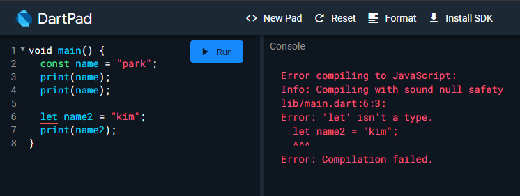 ● Dart에서도 JS와 같이 var 대신에 let 이나 const를 쓸 수 있나?