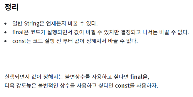 - final과 const 모두 한 번 값을 대입하면 변경할 수 없다.