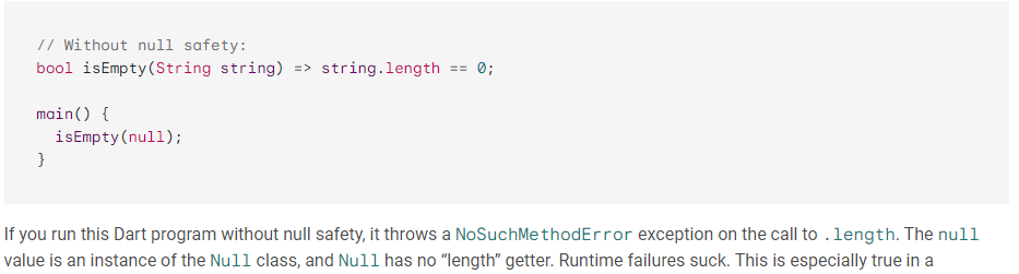 - 이런 오류가 발생하지 않으려면 null 값에 대한 보호가 있어야하며 따라서 Dart는 Null Safety를 만들었다.