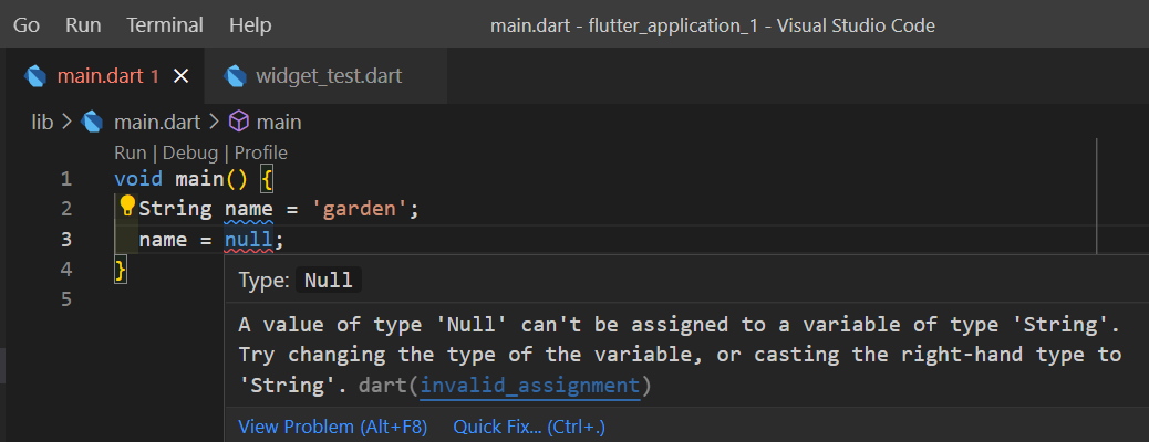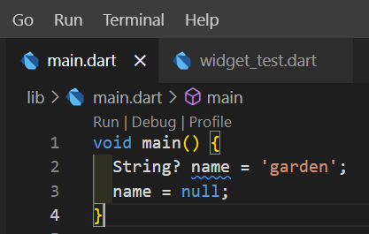 - dart에서는 어떤 변수가 null이 될 수 있음을 정확히 표시해야 한다.
