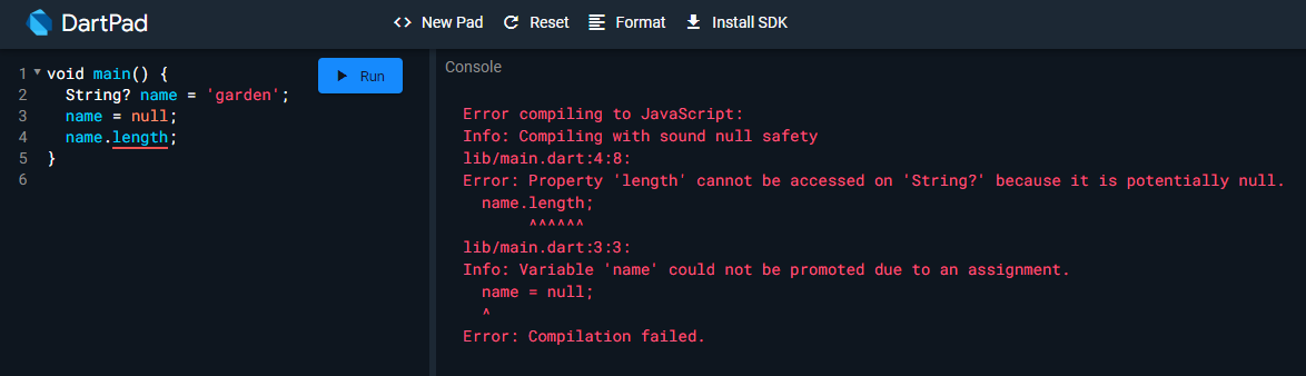 - 만약 Null Safety가 없는 버전의 Dart에서 해당 코드를 실행하면 런타임 에러가 발생할 것이다.
