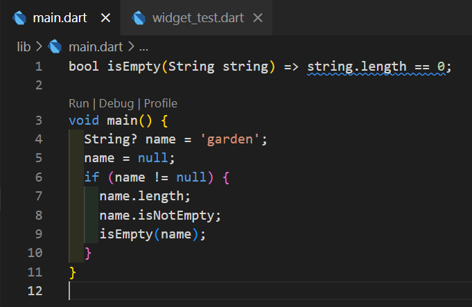 - name 변수를 사용하기전에 null 체크를 먼저 해줬기에 빨간줄이 뜨지 않는 것을 확인할 수 있다.