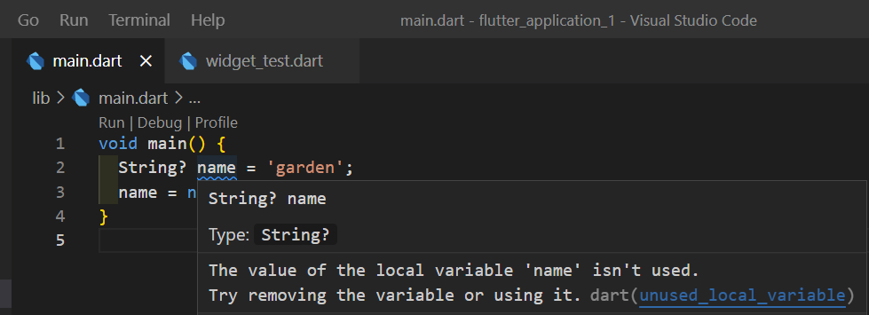 - ? 가 붙음으로 인해 Dart가 name 변수는 String이 될 수도 혹은 null이 될 수도 있다는 것을 알기 때문이다.