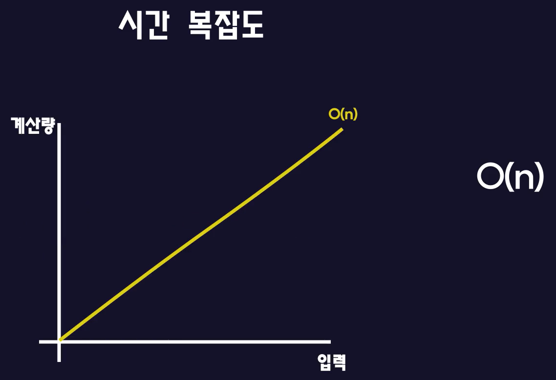 - 이것을 Big-O 표기법으로 O(n) 이라고 표현하며 그래프는 아래와 같다.
