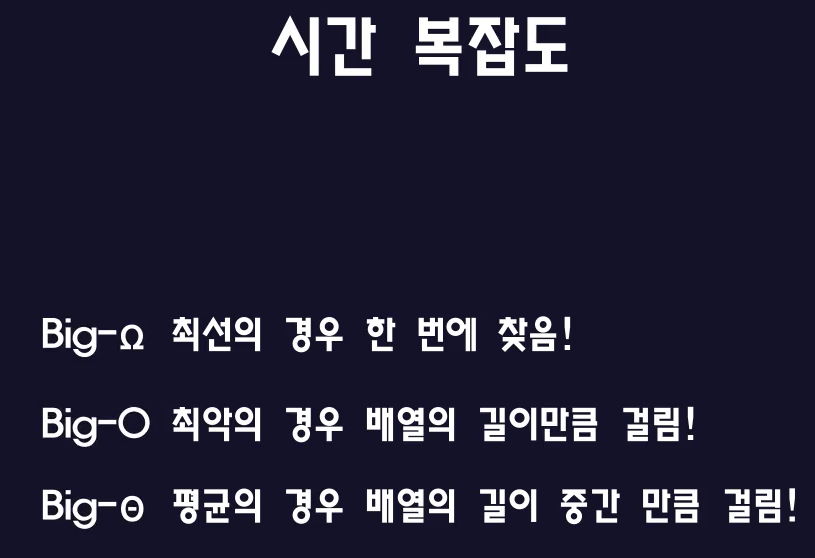 - 이것을 일반화하면 → 배열에 데이터가 n개 있다면 n번 만에 원하는 데이터를 찾는 것이다.