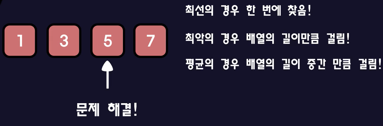 - 위 배열에서 5를 찾는 가장 최악의 경우는 5가 배열의 가장 마지막에 있어서 모든 배열을 순회해야하는 경우라고 했다.