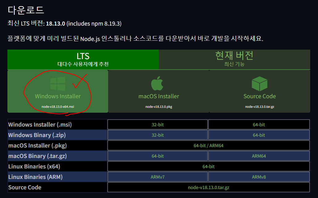 - JS, VScode는 따로 준비할 필요가 없고(이미 있으니) Node.js만 다운받을 것이다.