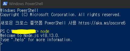 - PowerShell을 킨 후 node 라고 입력, 아래 사진처럼 되면 설치 완료