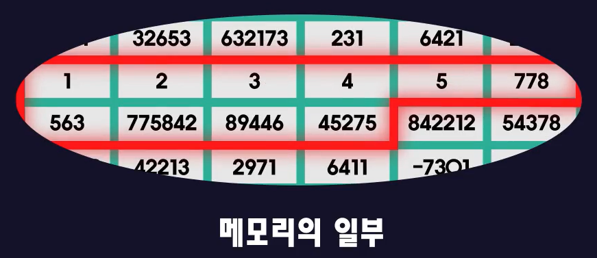 - 운영체제가 메모리에서 숫자 10개가 들어갈 수 있는 연속된 빈 공간을 찾아 순서대로 1, 2, 3, 4, 5 를 할당한다.