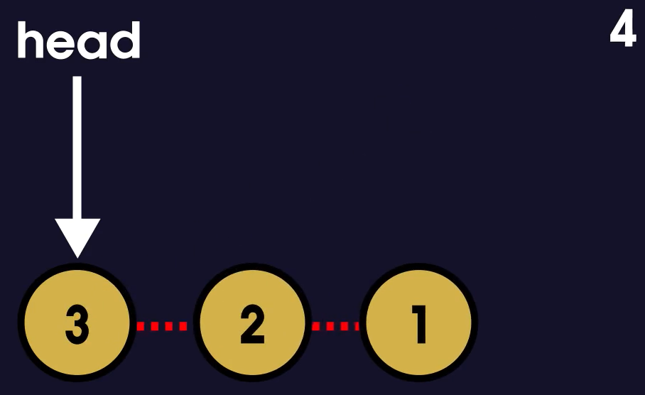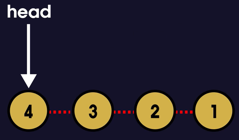 - 마찬가지로 3과 4를 차례대로 가장 앞 부분에 삽입, 그렇게 되면 4를 담은 node가 가장 앞에 위치한다.