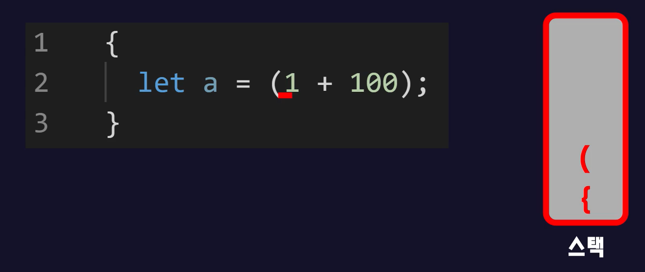 - 코드를 전부 검사했는데 Stack에 데이터가 남아있거나 괄호의 짝이 맞지 않으면 문법 에러가 발생했다고 판단한다.
