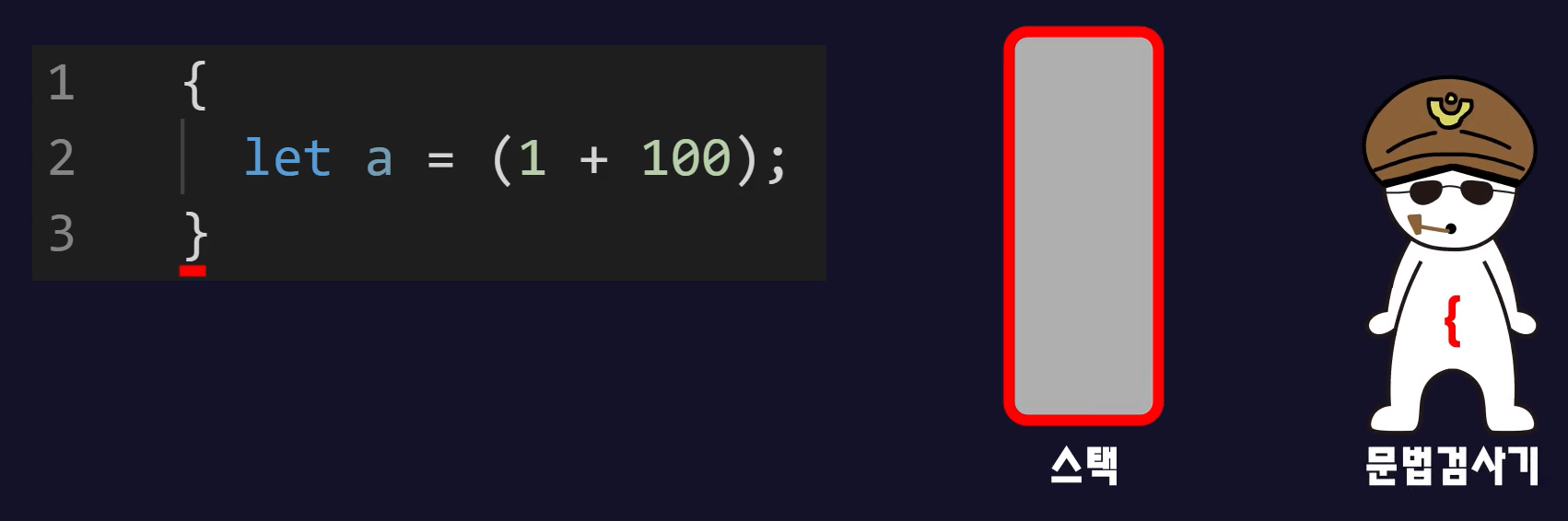 - 검사기는 더 이상 체크할 코드도 없고 Stack도 비어있기에 문법 에러가 발생하지 않았다고 판단한다.