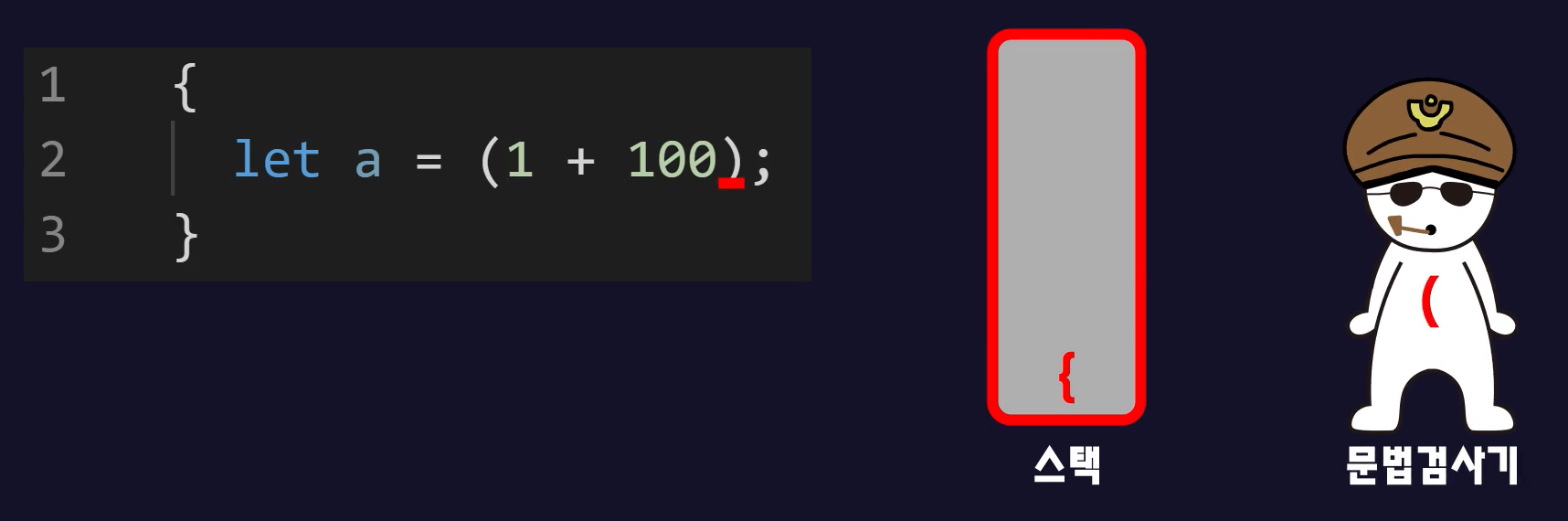 - 위의 코드에서 중괄호, 소괄호에 대한 문법 검사는 아래와 같은 방식으로 이루어진다.
