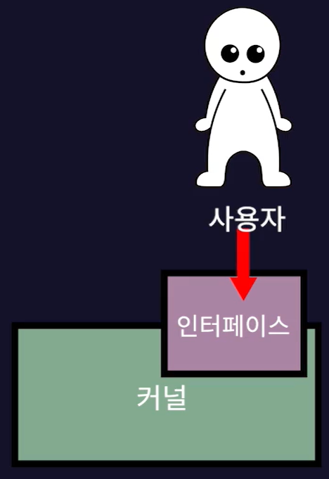 - 사용자는 운영체제의 커널에 직접 접근할 수는 없고 인터페이스를 통해서 접근할 수 있다.